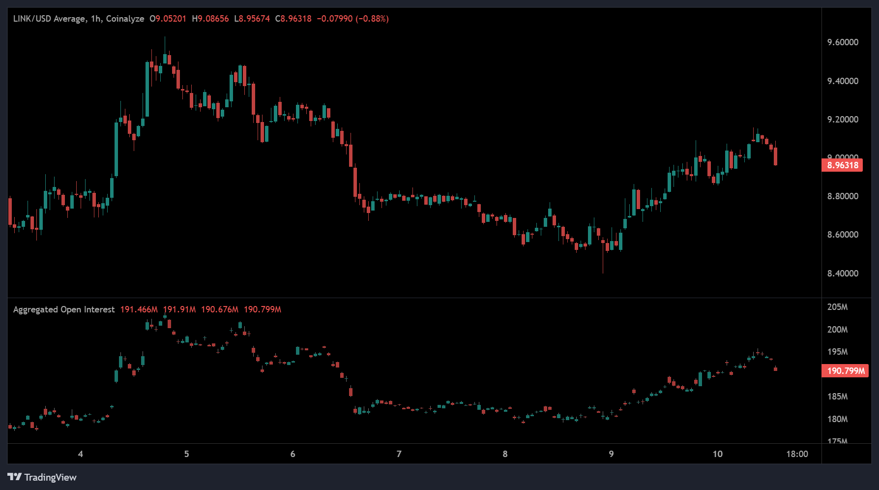 Open interest data are correlated with the price chart of LINK/USD, which is trading close to the price of about $8.963, opening around the price of about $9.052. The market momentarily hit a high of about $9.086 in the same session, then hit a low of about $8.956.