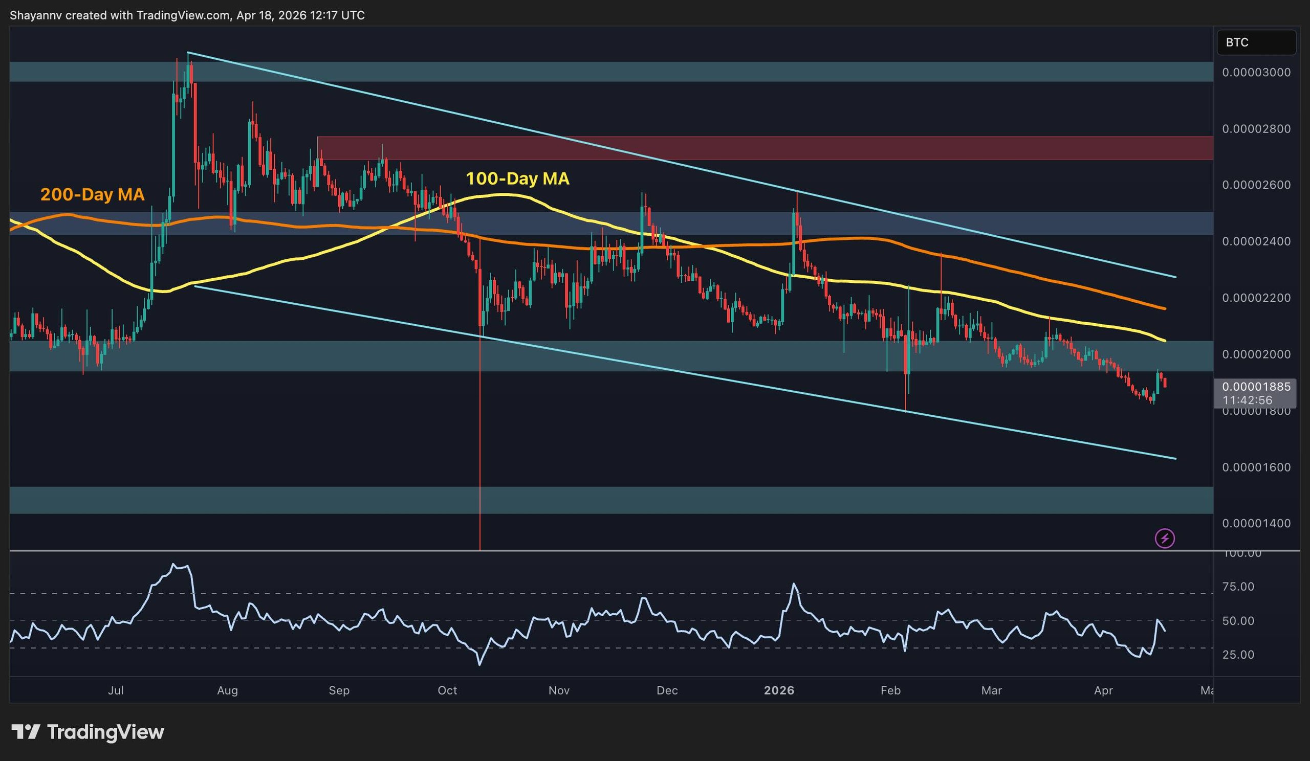 Both the 100-day MA (~2,000 sats) and 200-day MA (~2,100 sats) remain well above and declining, with the descending channel structure firmly intact. The RSI has bounced from deeply oversold territory in the low-20s back toward the mid-40s, which could support a short-term relief bounce on this pair, but a bounce is very different from a reversal.